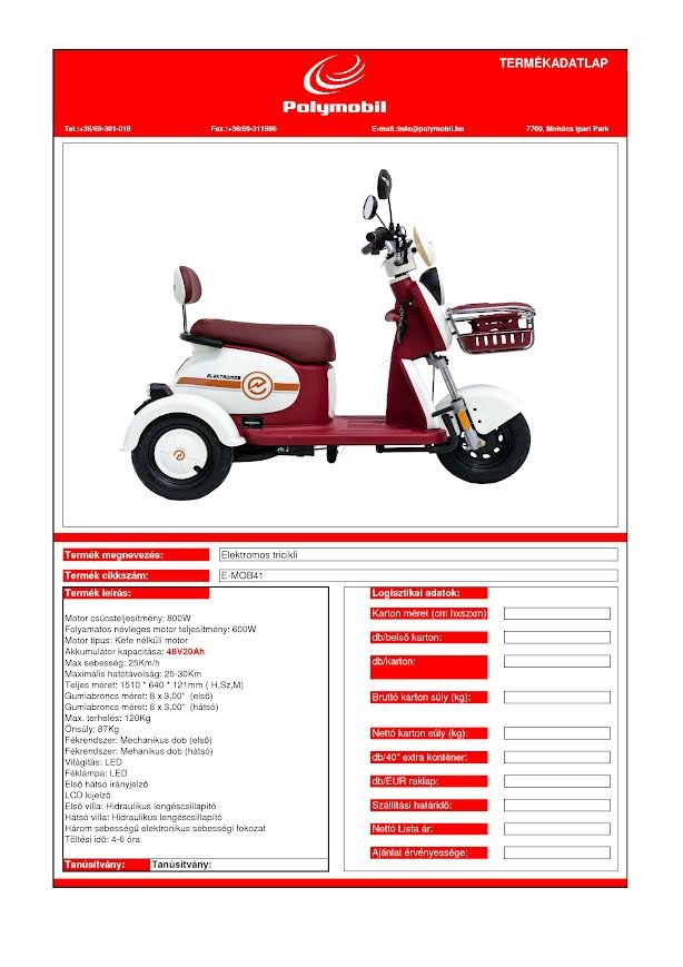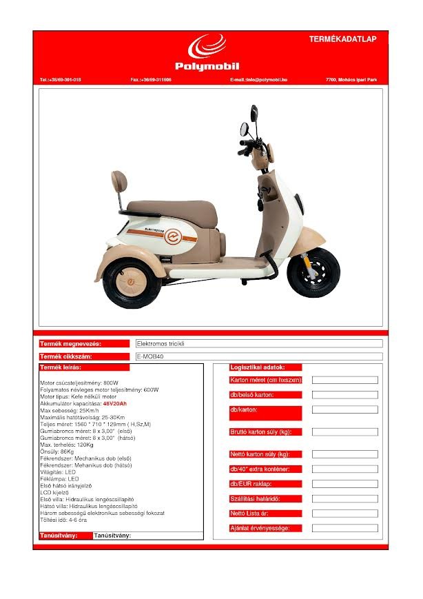 A Polymobil EMOB 40 és EMOB 41 két rendkívül népszerű elektromos robogó, amelyek tökéletesek mindennapi közlekedésre, bevásárláshoz, rövidebb városi utakra és kényelmes ingázásra. Csendesek, gazdaságosak és minimális karbantartást igényelnek.